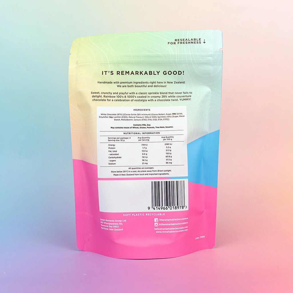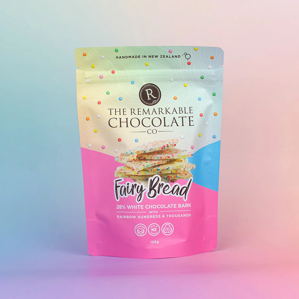 A nostalgic twist on a childhood favourite. This luxury bark is crafted with creamy 28% white chocolate and mixed through with colourful 100s & 1000s for that iconic Fairy Bread crunch in every bite.